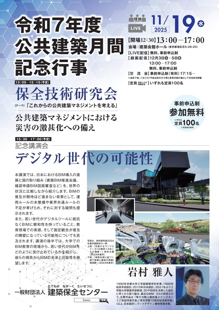 ホーム講習会・研修、講演会等講演会 保全技術研究会・記念講演会 2025年10月7日 毎年11月に、時節にあった著名な講師を招いて「公共建築月間及び公共建築の日の記念講演会」を開催しています。併せて建築保全センター保全技術研究所の「研究発表」を行っています。 詳細・お申込みはこちらから